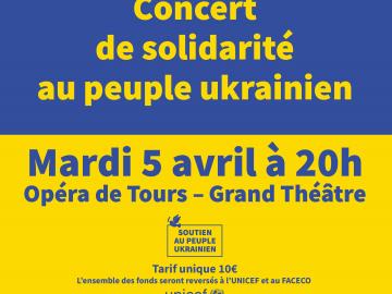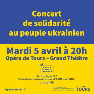 A l’initiative des équipes administratives et artistiques de l’Opéra de Tours – Grand Théâtre, et avec l’appui de la Ville de Tours, un concert exceptionnel en soutien au peuple ukrainien est organisé le 5 avril prochain. La soirée est proposée au tarif unique de 10€, l’intégralité des fonds récoltés sera reversée au Faceco*, Fonds d’action extérieure des collectivités territoriales à destination des victimes de crises humanitaires.